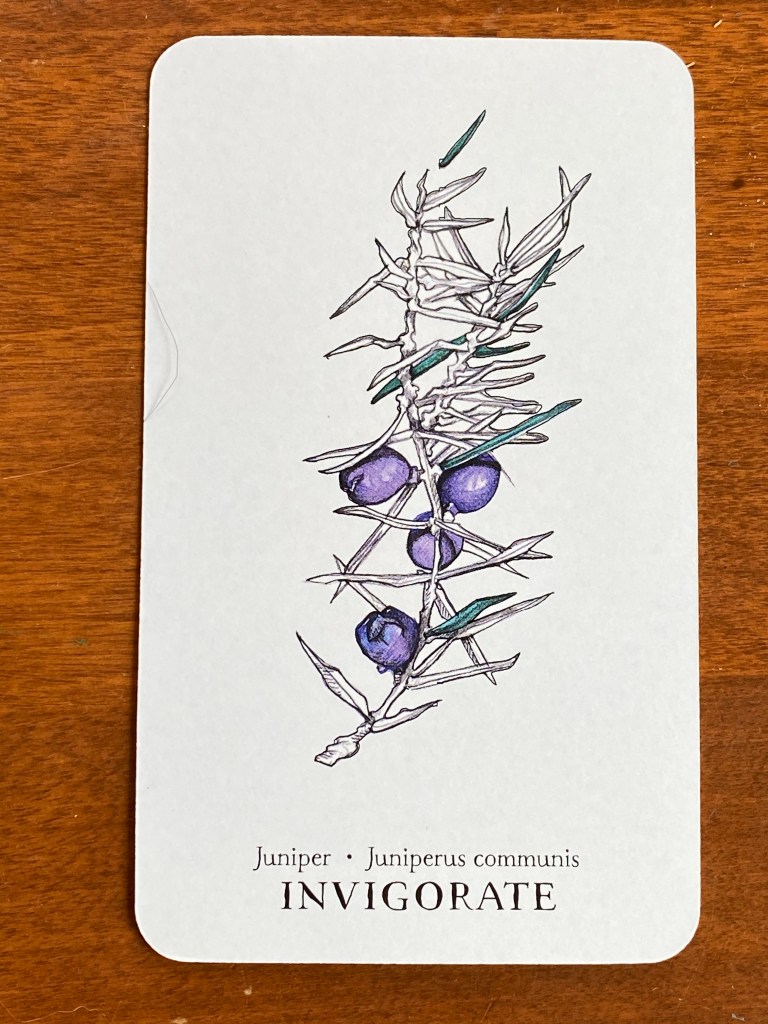 The essential oil of this plant is considered to be very invigorating. After a year of living in the pandemic blur, I can benefit from the wake up call this plant promises. It’s springtime, the earth is awakening, and so are its people after this long period of quiet isolation known as pandemic quarantine. As more people have become vaccinated, I’m sensing the tentative beginnings of plans being made for the forthcoming year. I hope the energy to pursue our passions with much more passion and vigor than was possible over the past year will also be in the cards. At least this card promises that!